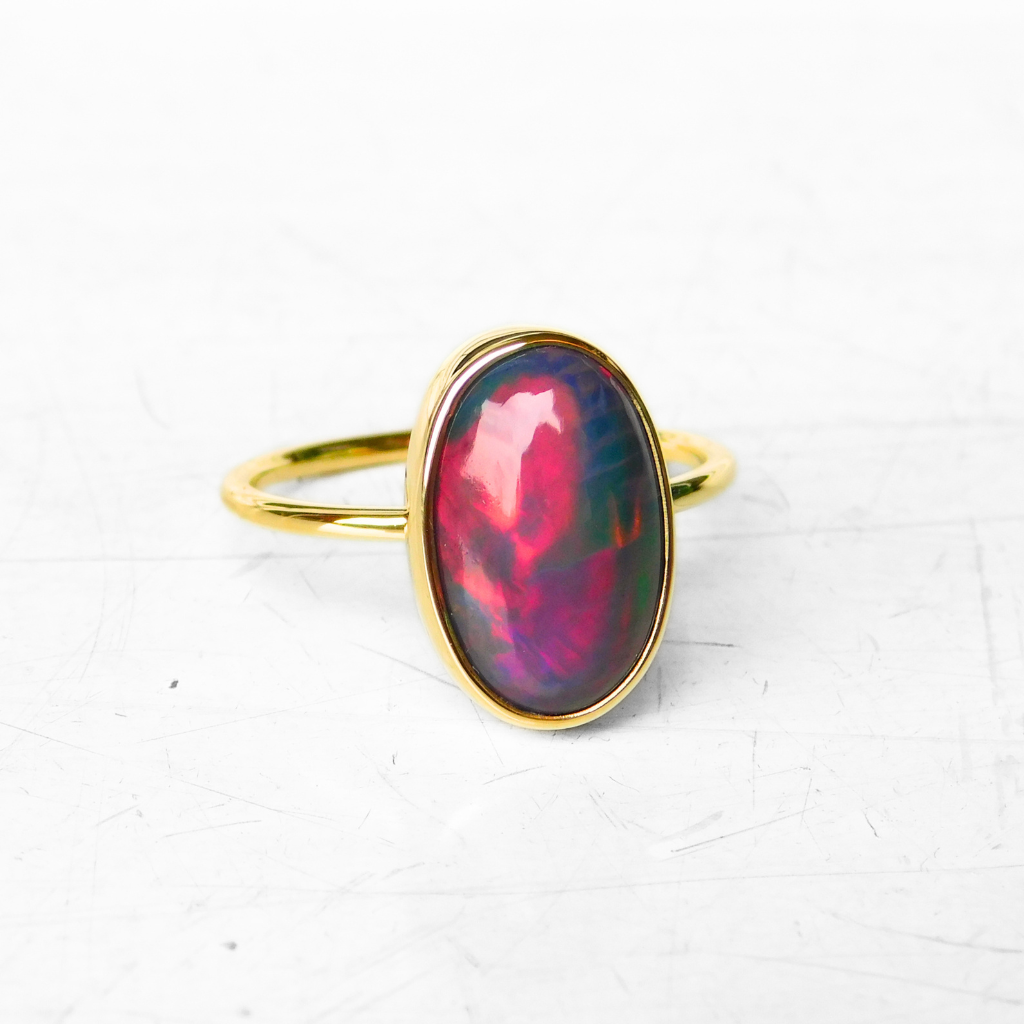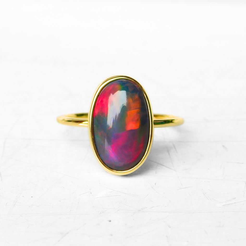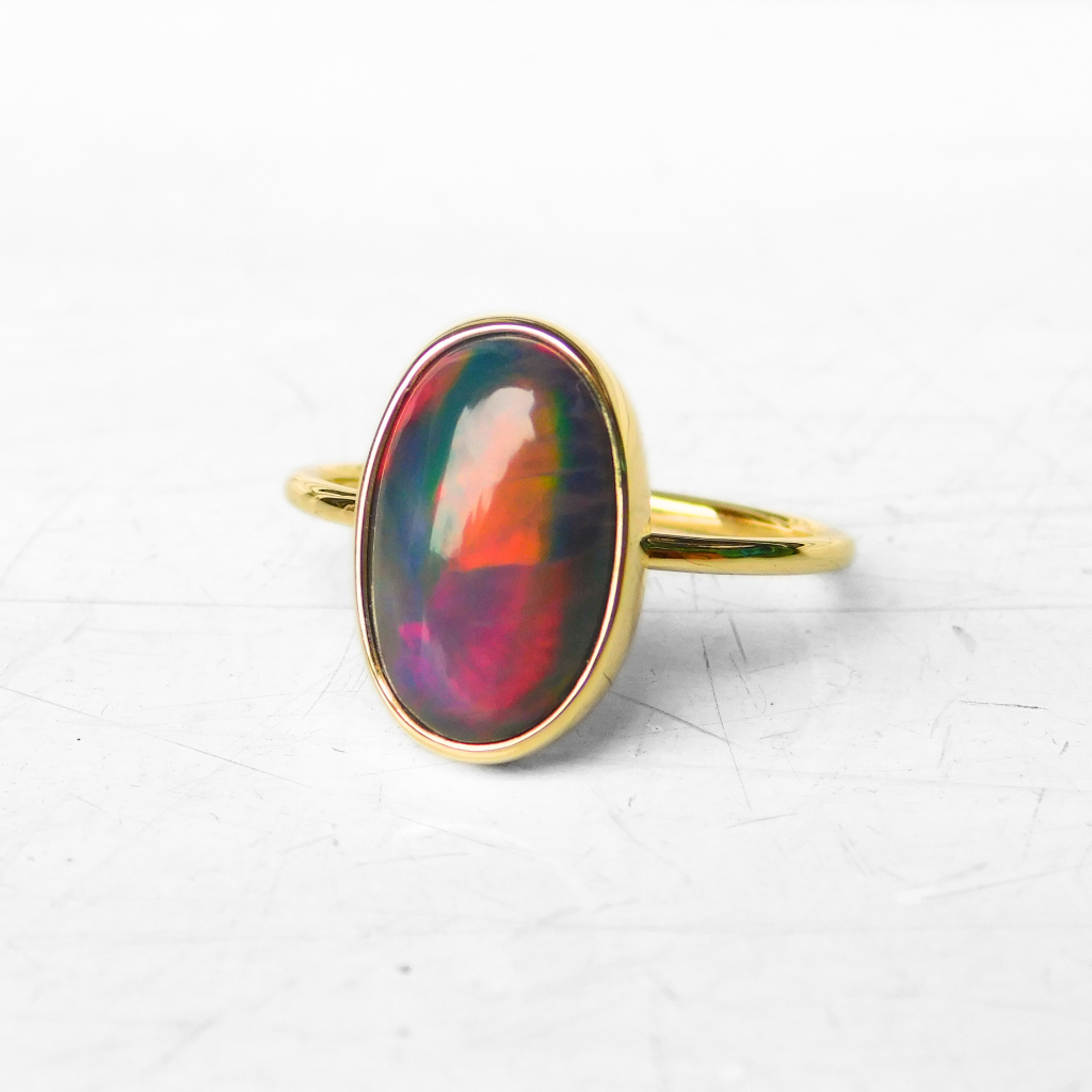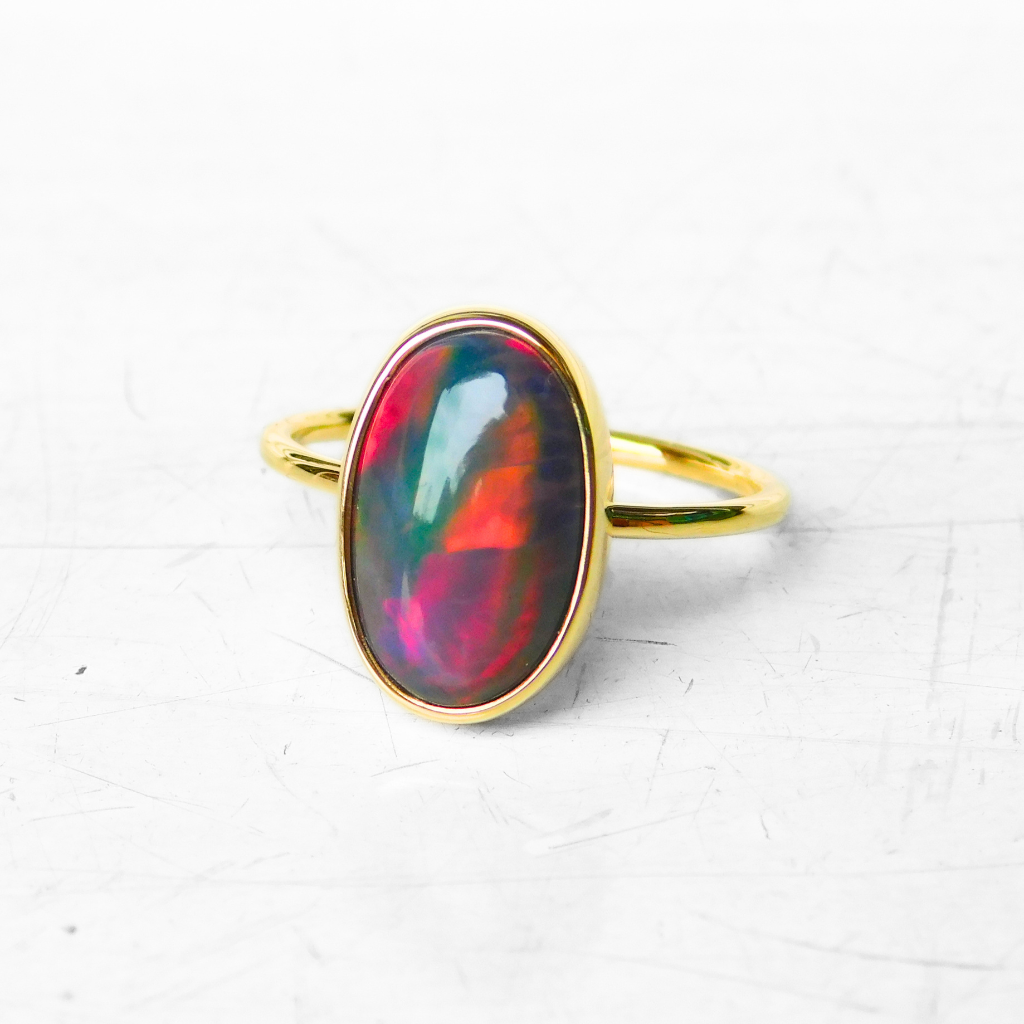 Pierścionek wykonany w pełni ręcznie z żółtego złota 585 w pojedynczym egzemplarzu. Punktem centralnym jest naturalny opal czarny z Afryki o pięknej grze barw.