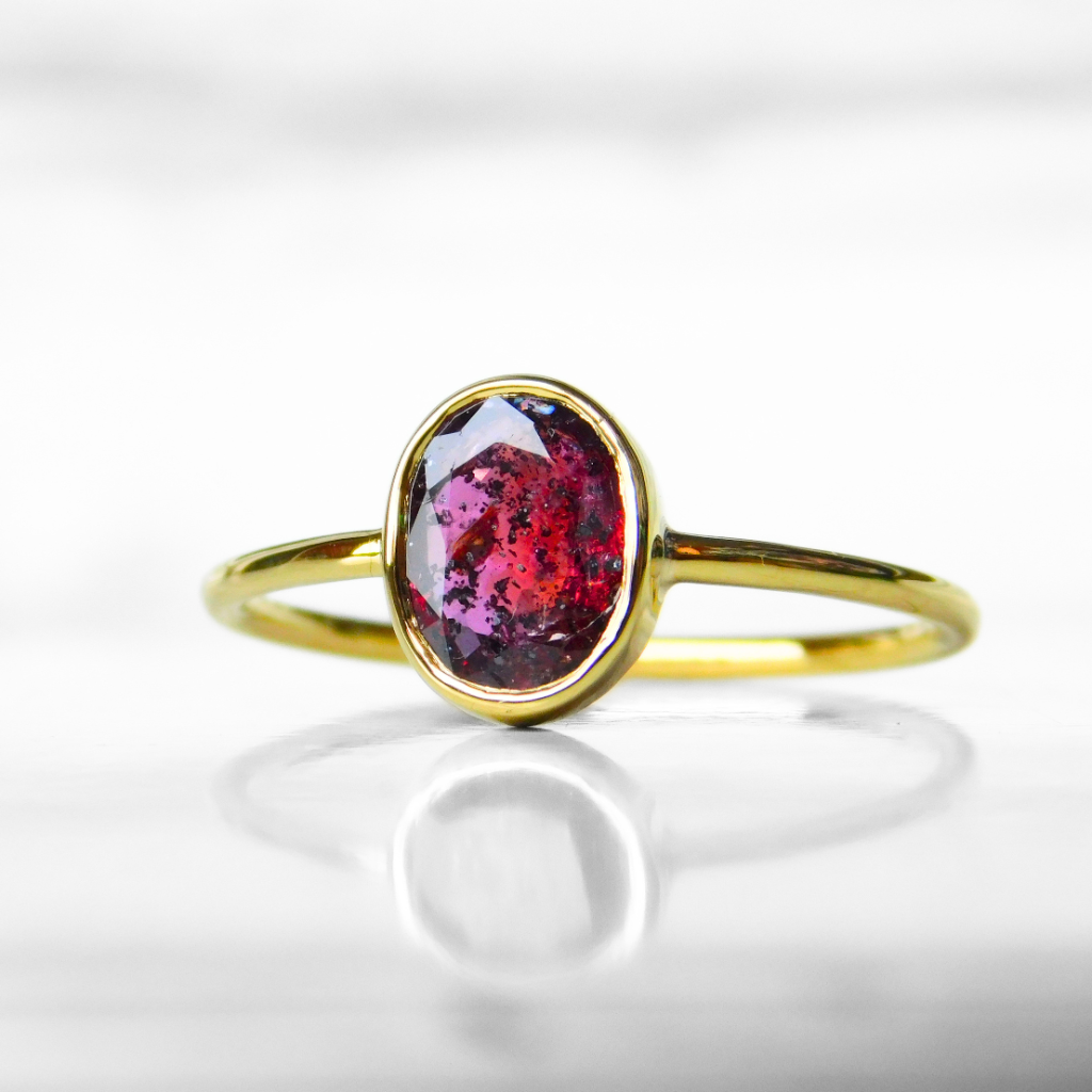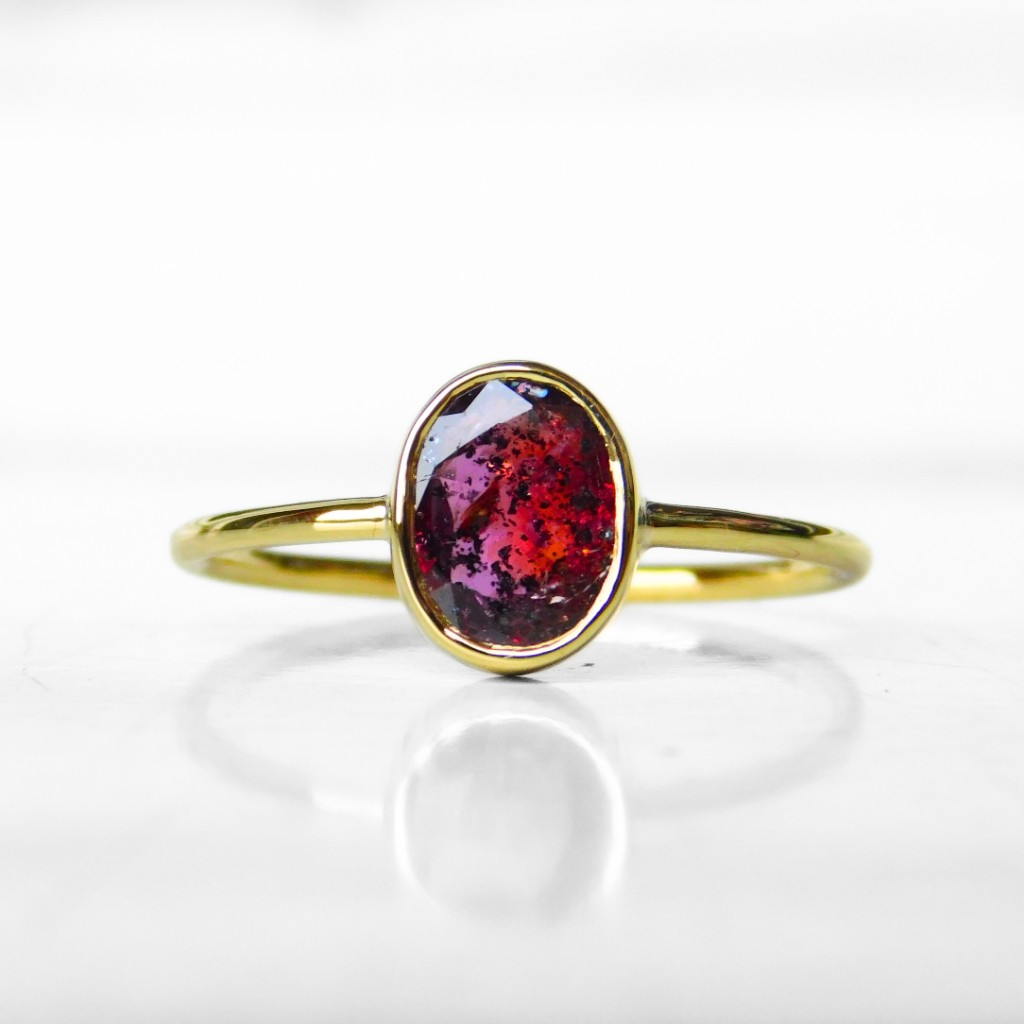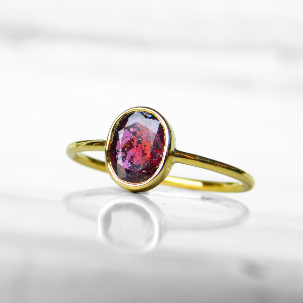 Pierścionek wykonany ręcznie z żółtego złota 333 w pojedynczym egzemplarzu. W tym pierścionku oprawiony został naturalny owalny różowo fioletowy szafir z Madagaskaru.Szyna pierścionka o profilu okrągłym i średnicy 1.25 mm.