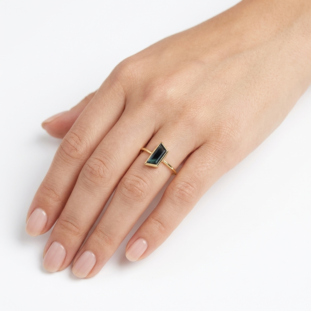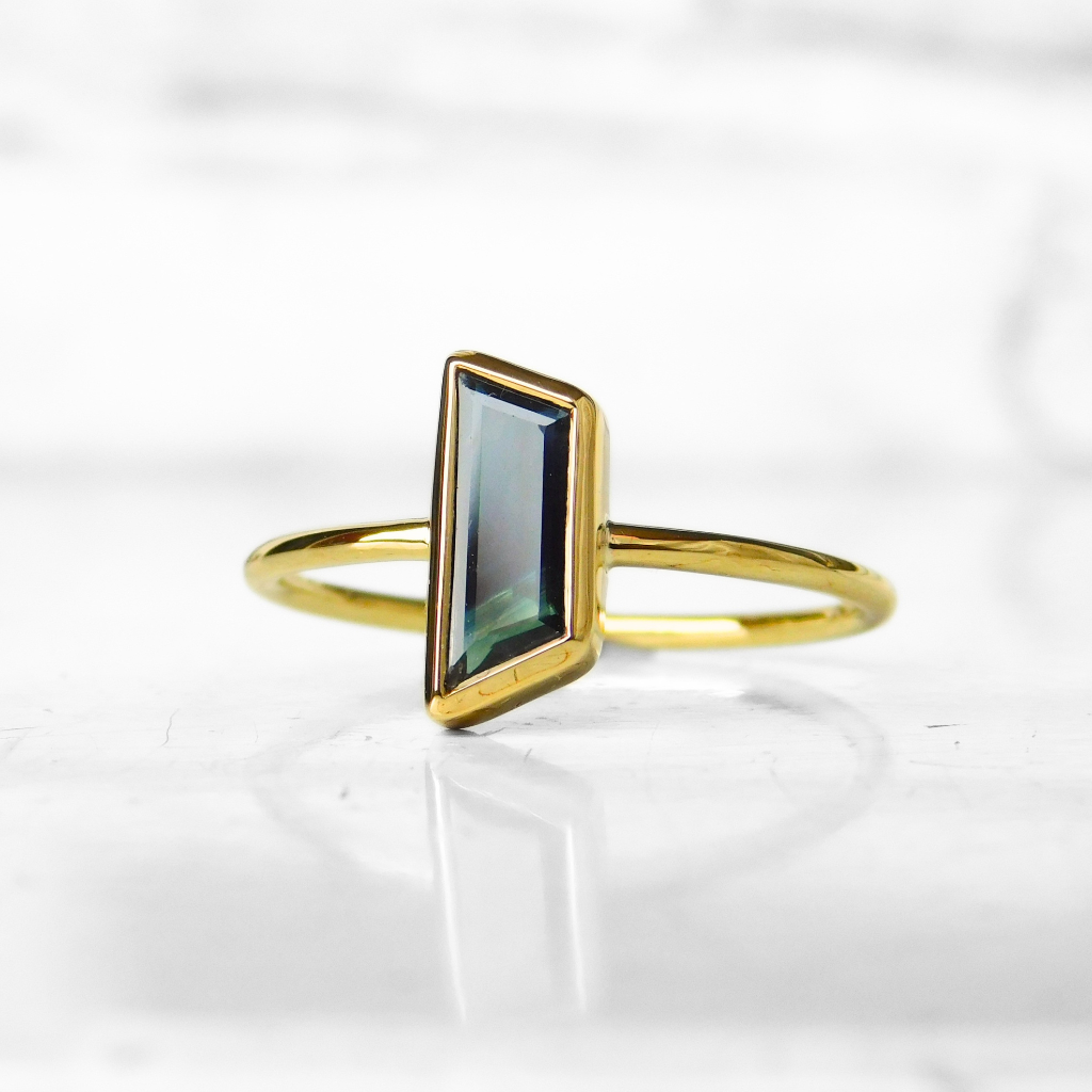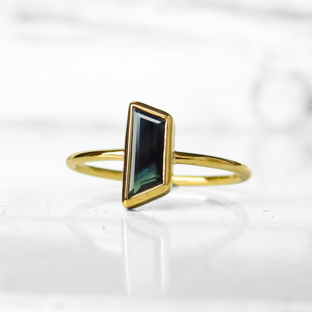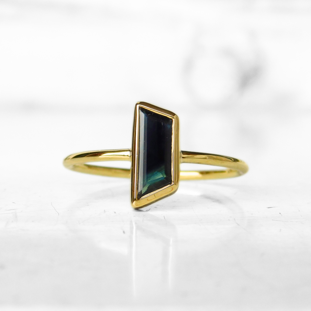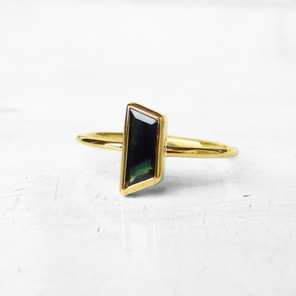 Pierścionek wykonany ręcznie z żółtego złota 585 w pojedynczym egzemplarzu. W tym pierścionku oprawiony został naturalny szafir afrykański w fantazyjnym szlife ciemnogranatowej barwie. Szyna pierścionka o profilu okrągłym i średnicy 1.25 mm.